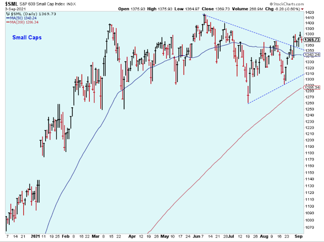 The small-caps rallied past their 50-day which is bullish, but now they need to show upside follow-through or at least that they can maintain prices in the top half of this sideways pattern. On Friday, Aug. 27, this index showed a strong rally above the 50-day, and the break above the downtrend line was sharp.