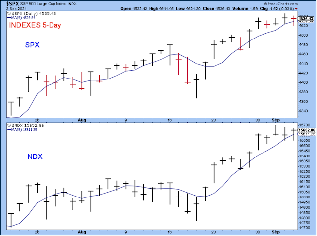 The SPX and the NDX remain above the 5-day averages, which is an indication that there is strength remaining in the short-term trend. When we start seeing closes under the 5-day, it doesn't necessarily mean that the short-term uptrend is ending, but it does mean that some of the market tailwind is easing up and that people are starting to take some of their profits. On any subsequent rallies back above the 5-day I start to sell into strength by trimming positions.