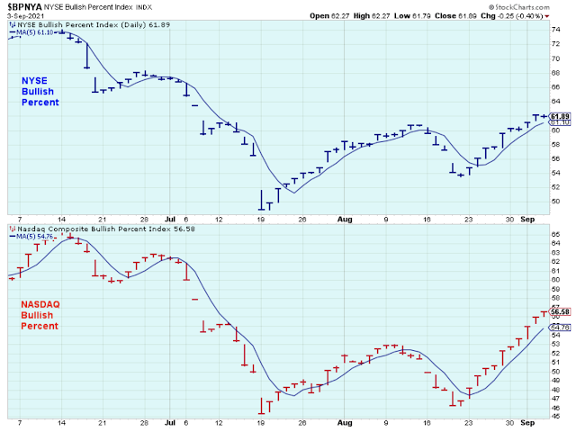 The bullish percents continue to climb higher, although the Nasdaq bullish percent is subtly stronger than the NYSE. The Nasdaq has been consistently closing at the top of the daily range, whereas the NYSE has had a few wobbly days. I like that both bullish percents have exceeded their August peaks.