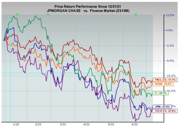 "The chart below shows the year-to-date performance of JPMorgan (blue line; down -27.5%) and Citigroup (green line; -22.3%), relative to the S&P 500 index (orange line; -18.2%), the Zacks Finance sector (red line; -17.1%) and the Zacks Tech sector (purple line; -27.6%)."