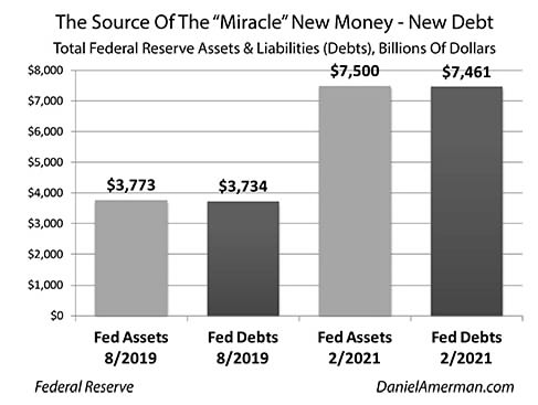 The assets of the Federal Reserve grew from $3,773 billion to $7,500 billion, which was an increase of $3,727 billion. The debts (liabilities) of the Federal Reserve grew from $3,754 billion to $7,461 billion, which was also an increase of $3,727 billion.