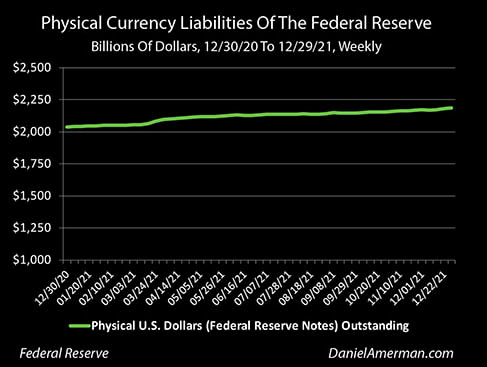 As shown in the graph above, which focuses on what happened in 2021, there was $2,038 billion in physical currency in circulation as of Dec. 30 of 2020. There was $2,187 billion in physical cash on the Fed balance sheet as of Dec. 29 of 2021.