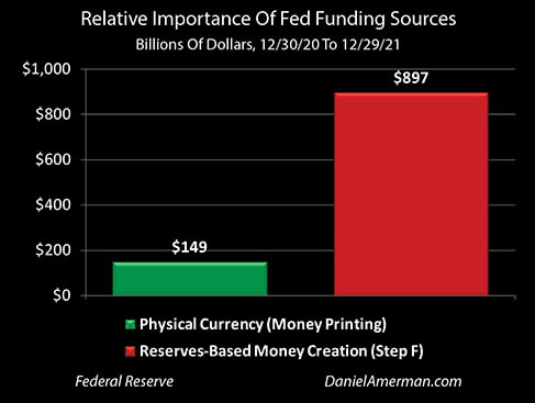 As shown in the graph above, we now have the facts to determine how much of the Fed's asset purchases were funded by money printing, versus how much were funded by the back door access to our bank accounts. The Fed gained $897 billion in funds from the banks, and $149 billion from money printing, so the back door access to our bank accounts provided almost exactly six times as much money as did the money printing.
