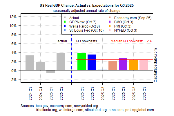 The government shutdown is delaying economic reports, but the latest numbers available continue to indicate a solid increase in the upcoming third-quarter GDP report, based on the median estimate for a set of nowcasts compiled by CapitalSpectator.com. The longer the shutdown lasts, however, the greater the uncertainty as the nowcast inputs age and fail to reflect the latest economic changes.