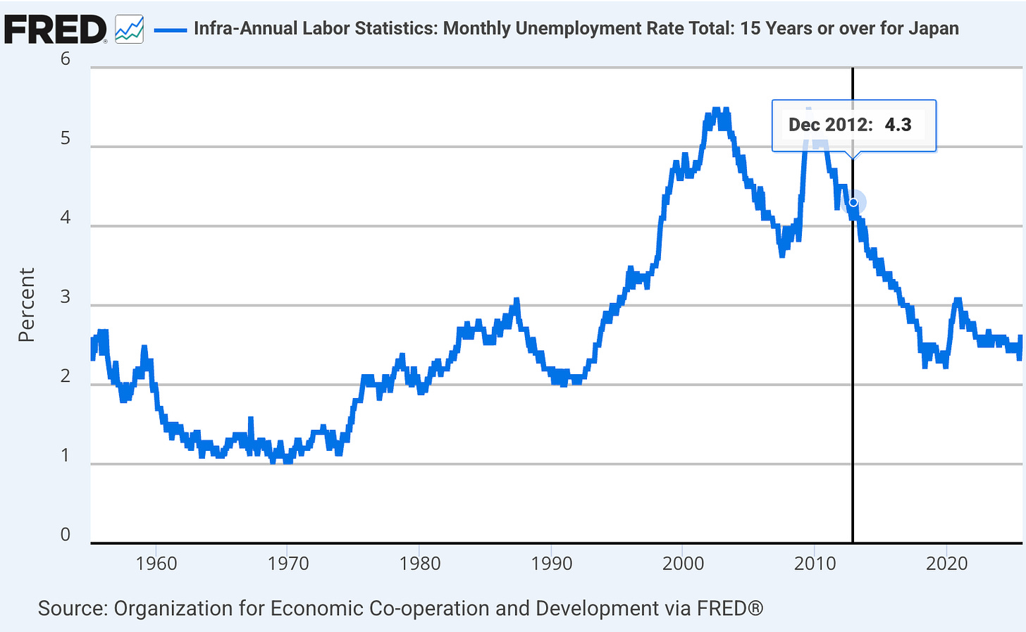 As predicted by the musical chairs model, the growth in NGDP helped to return Japanese unemployment back to its historical norms of close to 2%. Most real problems are structural and cannot be solved by improved monetary policy. One problem that can be solved is high unemployment that is caused by insufficient nominal growth: