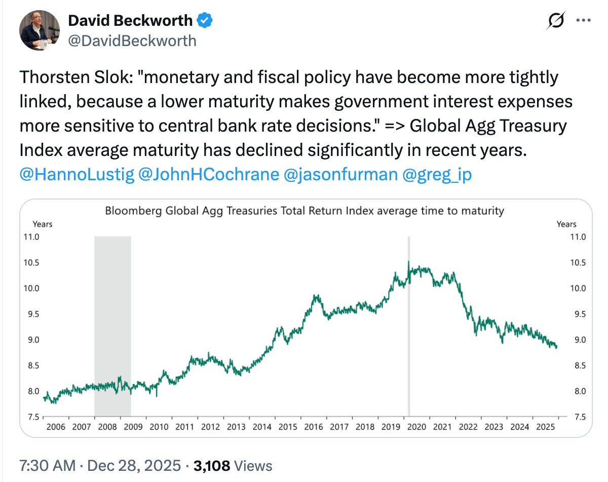 If Congress wishes to impose fiscal dominance, they would eventually need to tell the Fed to raise its inflation target above 2%. And don’t assume that 3% would solve the problem, it wouldn’t. One percent higher inflation reduces the real debt by an extra 1% each year, but it would also raise nominal interest rates by 1% due to the Fisher effect. At best, you get a one-time gain from reducing the real value of the existing stock of debt, but those gains are reversed the next time you revert to 2% inflation. Many people who read Thorsten Slok’s recent comments on monetary and fiscal policy might erroneously infer that fiscal dominance is a bigger problem when the debt is primarily short-term: