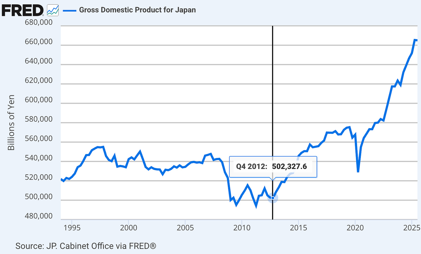 Interest rates were stuck at zero, and many economists argued the BOJ was “out of ammunition”. Instead, Abe’s policies ended deflation and led to significant growth in nominal GDP, which has continued right up to the present: