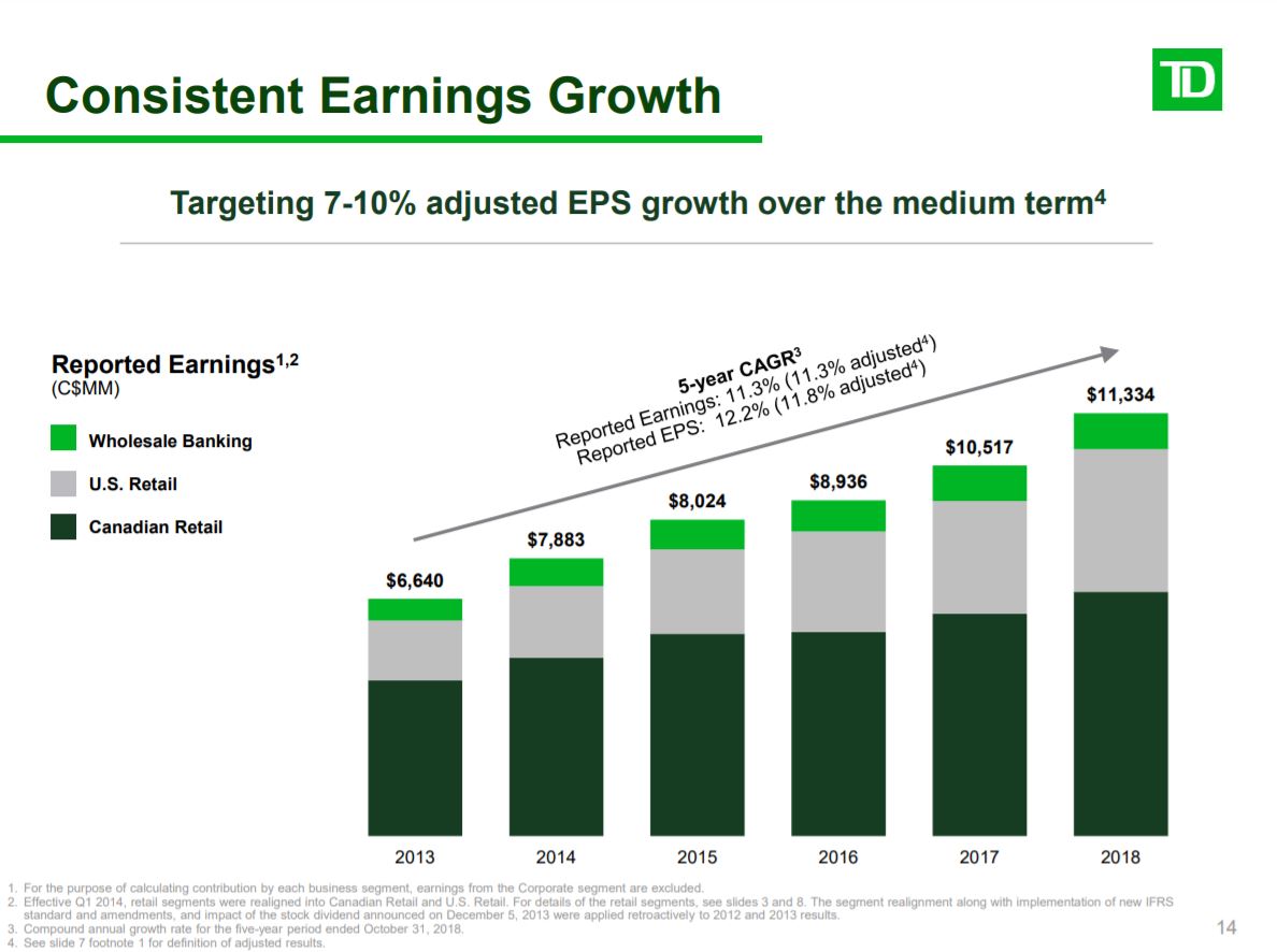 This summary investment thesis, while brief, indicates that TD has a solid balance sheet, is growing earnings, and increasing its distributions to shareholders. For a more complete picture of TD’s financials, the reader should spend some time browsing through the most recent investor presentation.