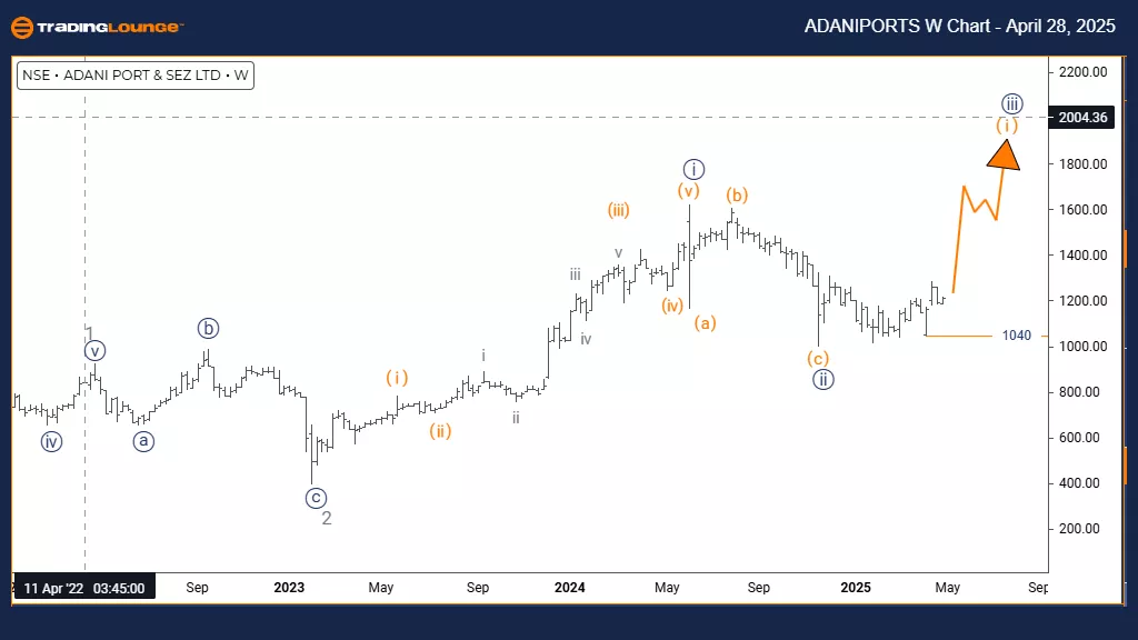 The ADANI PORTS & SEZ weekly chart analysis indicates a bullish trend forming through an impulsive Elliott Wave structure. The stock has completed the navy blue wave 2 correction and transitioned into orange wave 1 within the broader navy blue wave 3 formation. This setup marks the early phase of a fresh impulse wave that may deliver substantial upside momentum over the upcoming weeks.