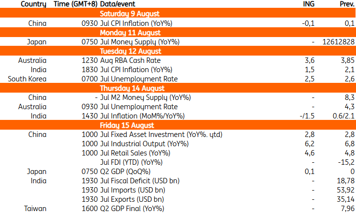 China releases its July inflation data this Saturday. Consumer price index inflation is expected to teeter back into deflation at -0.1% year on year as downward pressures persist. Measures to tackle excessive price competition are unlikely to have an impact in the early going.