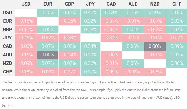 The table below shows the percentage change of Australian Dollar (AUD) against listed major currencies today. Australian Dollar was the weakest against the US Dollar.