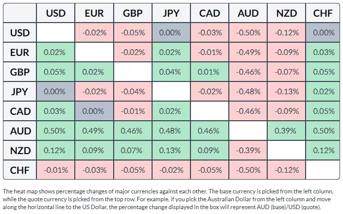 The table below shows the percentage change of the Australian Dollar (AUD) against the listed major currencies today. The Australian Dollar was the strongest against the US Dollar.