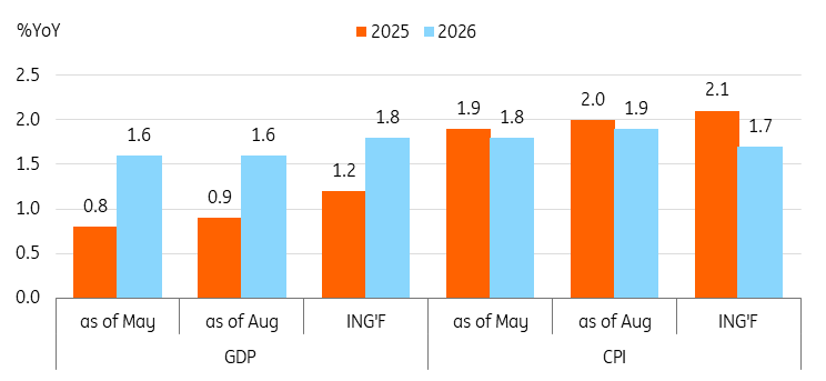 Inflation below 2% and a cautious growth outlook should support further easing measures. We continue to expect a 25 bp cut in October, followed by another in the third quarter of 2026. The timing of rate cuts in 2026 could move to the first half if the Fed eases faster or financial stability improves more than expected.