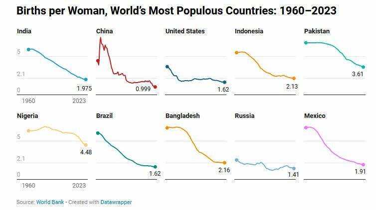 The fertility rate in India, the world’s most populous country, has steadily declined over the past six decades. In June, the UN Population Fund reported that India’s fertility rate stood at 1.9 children per woman, down from five or six children in 1960.