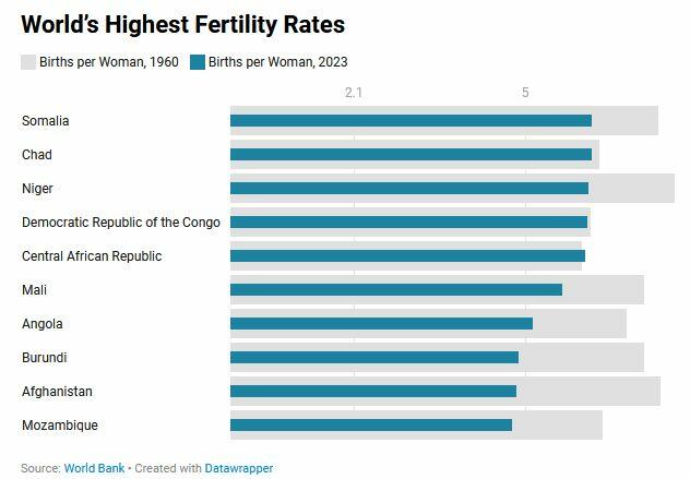 Meanwhile, look at who has the highest fertility rates: Somalia, Chad, Niger, DRC, and other African nations. Only about 4 percent of the world’s population reside in a country with a high fertility rate - more than five children per woman - and all of those nations are in Africa, the Census Bureau noted. Even in those countries, fertility rates are generally lower than they once were.