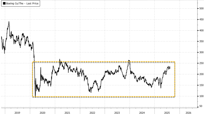 Bloomberg's news story sent Boeing shares up as much as 3.7% in premarket trading. The stock has been stuck in a 5.5-year channel following the twin 737 Max crashes, other aircraft setbacks, and investor pessimism fueled by toxic DEI initiatives on jet production lines.