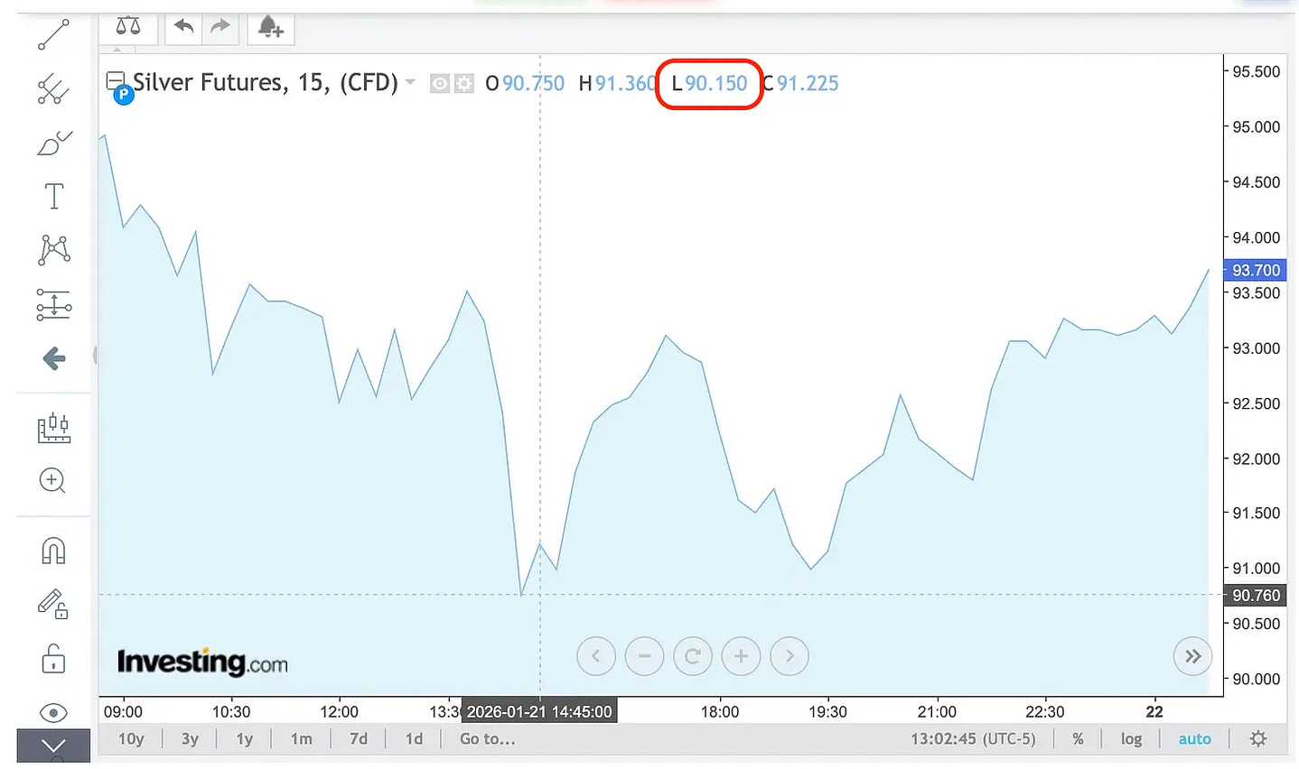 The silver futures hit a low of $90.15 yesterday afternoon after the sharp selloff that began just before 2 PM Eastern, but are currently up $3.26 to $95.90, and surged as high as $96.72 earlier this afternoon.