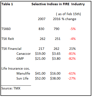 To appreciate just how much the F.I.R.E. industry has suffered , we turn to the TSX and its major components as listed in Table 1. In the period 2007 to 2014, the Canadian stock market as a whole fell by 4%. However, the financial sector as a whole performed relatively well increasing by some 21%, largely on the back of the commercial banks, supported by good loan growth and capital market activities.However, within the investment community, independent investment houses have taken quite a beating. The two publicly traded companies, GMP and Canaccord, have seen their corporate value truly been decimated (a price drop of 80%) . Finally, the life comapnies have yet to recover from the 2008 crisis and continue to see their stocks trade well below pre-crisis levels (as much as 60% lower).