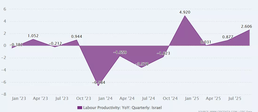 Economists prefer to look at total factor productivity which takes into account all the factors that go into a worker’s success. That includes workers’ education,capital investment available to each worker, along with estimates of growth not explained otherwise. Much of the unexplained factors relate to education and the introduction to new technologies over time. Using this more complete measure, Israel’s productivity performance shot up, once hostilities ended late in 2025.