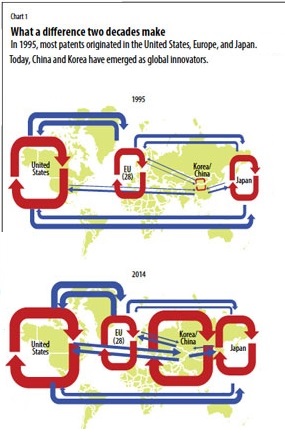 For many years, when you looked at international comparisons involving research and development or patents, you could summarize global patterns pretty well with just the US, Japan and Germany (and maybe a few other European countries, if you were feeling energetic). But now any sketch of the global science and technology economy would be incomplete without including China and Korea, too. Johannes Eugster, Giang Ho, Florence Jaumotte, and Roberto Piazza provide an overview in "How Knowledge Spreads: More rapid diffusion of know-how is an important benefit of globalization," in the September 2018 issue of Finance & Development (pp. 52-55).