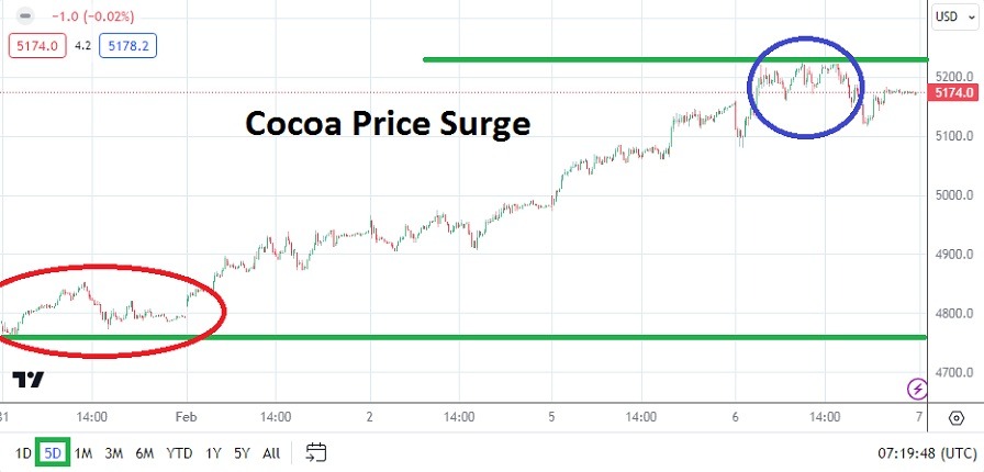- Since the start of January 2024, Cocoa has climbed in price from nearly 4033.9 on the 8th of January. Meaning more than a twenty percent rise in price has been seen in the commodity in a handful of weeks.