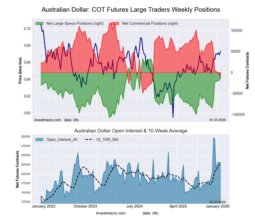 The Australian Dollar large speculator standing this week came in at a net position of -14,011 contracts in the data reported through Tuesday. This was a weekly gain of 4,835 contracts from the previous week which had a total of -18,846 net contracts.