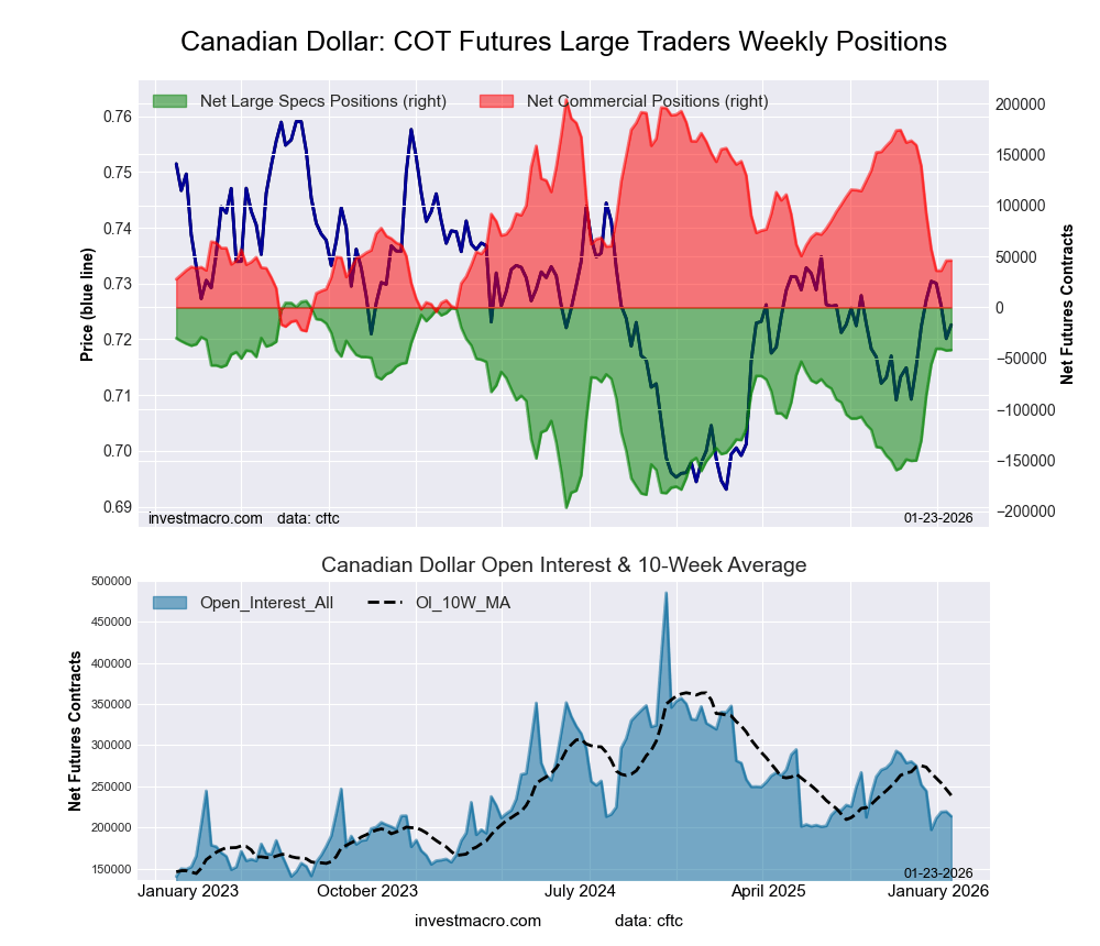The Canadian Dollar large speculator standing this week came in at a net position of -41,785 contracts in the data reported through Tuesday. This was a weekly lift of 465 contracts from the previous week which had a total of -42,250 net contracts.