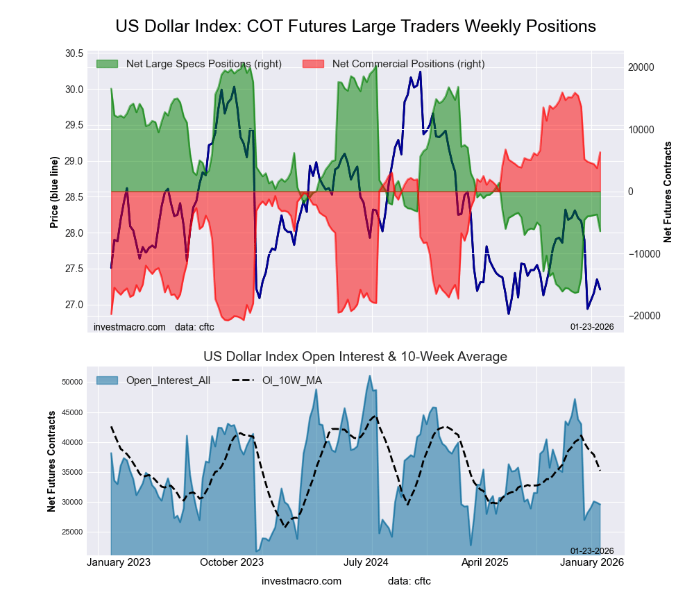 The US Dollar Index large speculator standing this week came in at a net position of -6,418 contracts in the data reported through Tuesday. This was a weekly decline of -2,688 contracts from the previous week which had a total of -3,730 net contracts.