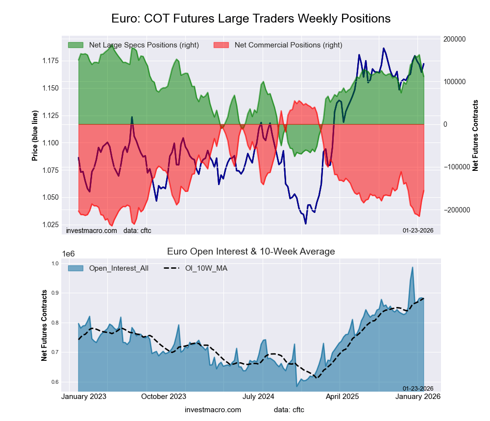 The latest COT data is updated through Tuesday January 20th and shows a quick view of how large market participants (for-profit speculators and commercial traders) were positioned in the futures markets. All currency positions are in direct relation to the US dollar where, for example, a bet for the euro is a bet that the euro will rise versus the dollar while a bet against the euro will be a bet that the euro will decline versus the dollar.