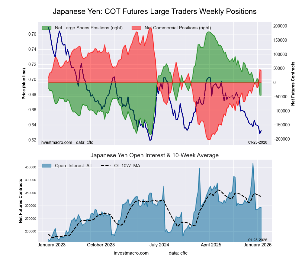 The Japanese Yen large speculator standing this week came in at a net position of -44,829 contracts in the data reported through Tuesday. This was a weekly boost of 335 contracts from the previous week which had a total of -45,164 net contracts.