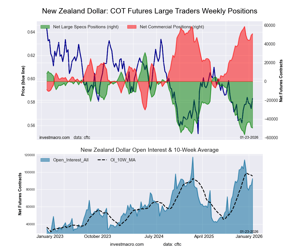 The New Zealand Dollar large speculator standing this week came in at a net position of -49,610 contracts in the data reported through Tuesday. This was a weekly reduction of -759 contracts from the previous week which had a total of -48,851 net contracts.