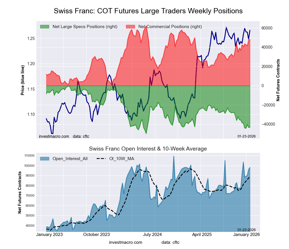 The Swiss Franc large speculator standing this week came in at a net position of -43,207 contracts in the data reported through Tuesday. This was a weekly increase of 185 contracts from the previous week which had a total of -43,392 net contracts.
