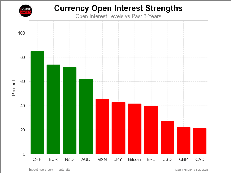 On the downside, the New Zealand Dollar (8 percent) and the Swiss Franc (13 percent) come in at the lowest strength levels currently and are in Extreme-Bearish territory (below 20 percent). The next lowest strength scores are the US Dollar Index (27 percent) and the British Pound (30 percent).