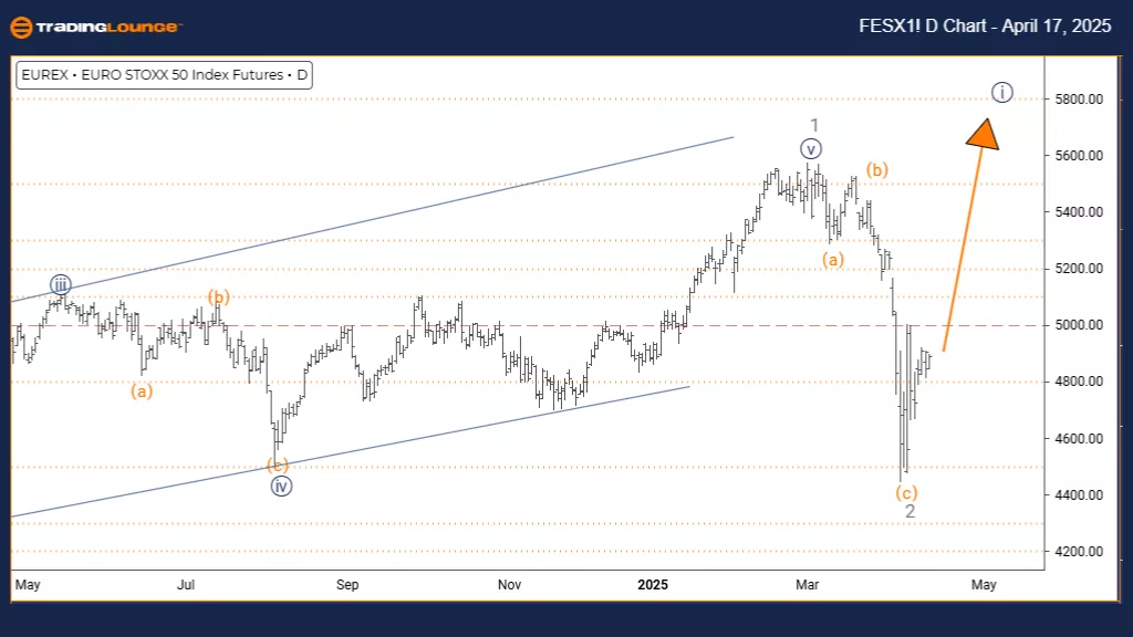 The Euro Stoxx 50 daily chart reveals a bullish trend forming through an impulsive Elliott Wave setup. With gray wave 2 now completed, the index has entered navy blue wave 1, which is part of the larger gray wave 3 formation. This marks the start of a fresh impulsive leg with potential for sustained upward momentum in upcoming sessions.