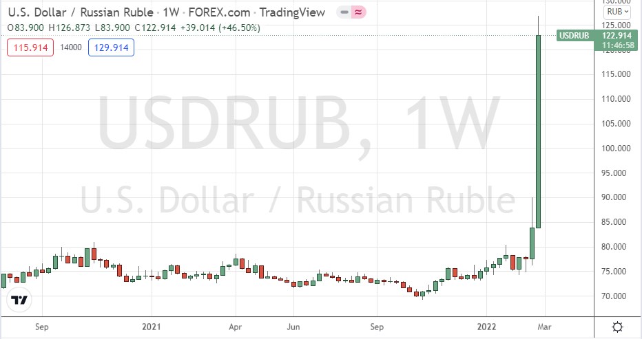 The Russian ruble lost about half its value against the US dollar and almost every other currency last week. However, it is practically impossible to trade the ruble as it barely convertible now, and there are no Forex brokers offering it anyway. It is worth noting that a currency that loses half its value in a week is on the verge of collapse.