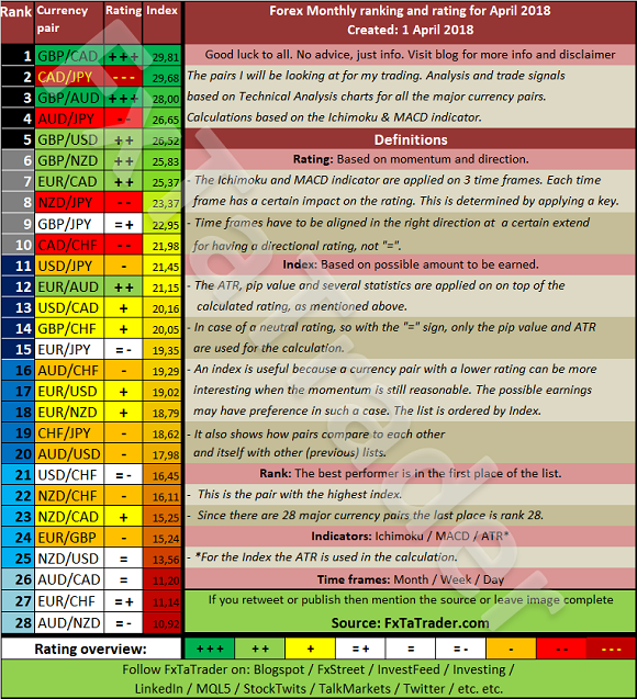 Analysis based on TA charts for all the major currency pairs. Every month the Forex ranking rating list will be prepared around the change of the month. All the relevant Time Frames will be analyzed and the ATR and Pip value will be set.