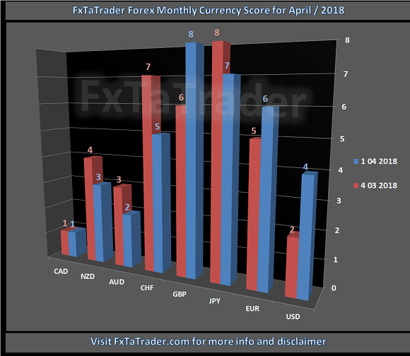 The Currency Score analysis is one of the parameters used for the Ranking and Rating list which is published also in this article. The Currency Score is my analysis on the 8 major currencies based on the technical analysis charts using the MACD and Ichimoku indicator on 4 Time Frames: the monthly, weekly, daily and 4 hours. The result of the technical analysis is the screenshot here below.