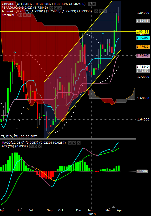 The Chart for this month is the GBP/AUD Weekly chart and the set-up is a Long Entry. Price is clearly in an uptrend and gaining momentum. Price broke a few months ago through an important resistance level, see the yellow dotted line, which is now a support. It may pull back to that support level and even towards the Tenkan-Sen in the coming period and this is a nice buy opportunity.