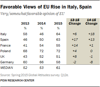 The first Great Graphic shows the percentage of people with a favorable opinion of the EU. It shows the change 2013-2015 for selected countries. Over this period it rose in all countries save Germany. Of the six countries reviewed, less than half of those surveyed had a favorable view of the EU in 2013. This year more than 50% in all the countries have such a view. The median was 52% in 2013, and this has risen to 61% this year.