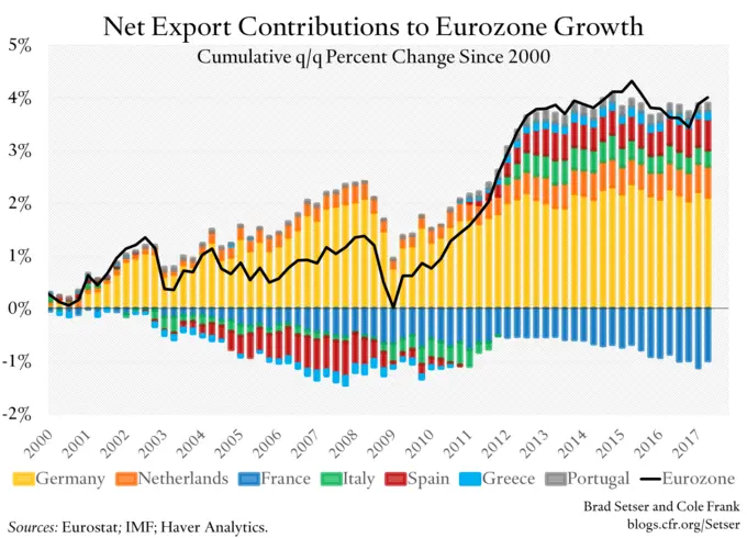 Setser elaborates on the rather obvious point that the eurozone’s attempt at fiscal austerity in the years 2011–13, when the currency union experienced the second leg of its double-dip recession, was counterproductively harsh: The consolidation observed between 2011 and 2013, based on the overall change in the primary structural balance of general government, is now estimated by the European Commission at almost 2.9% of potential GDP…the fiscal effort was 1.5 percentage points of GDP in 2012. (Banque de France 2017)