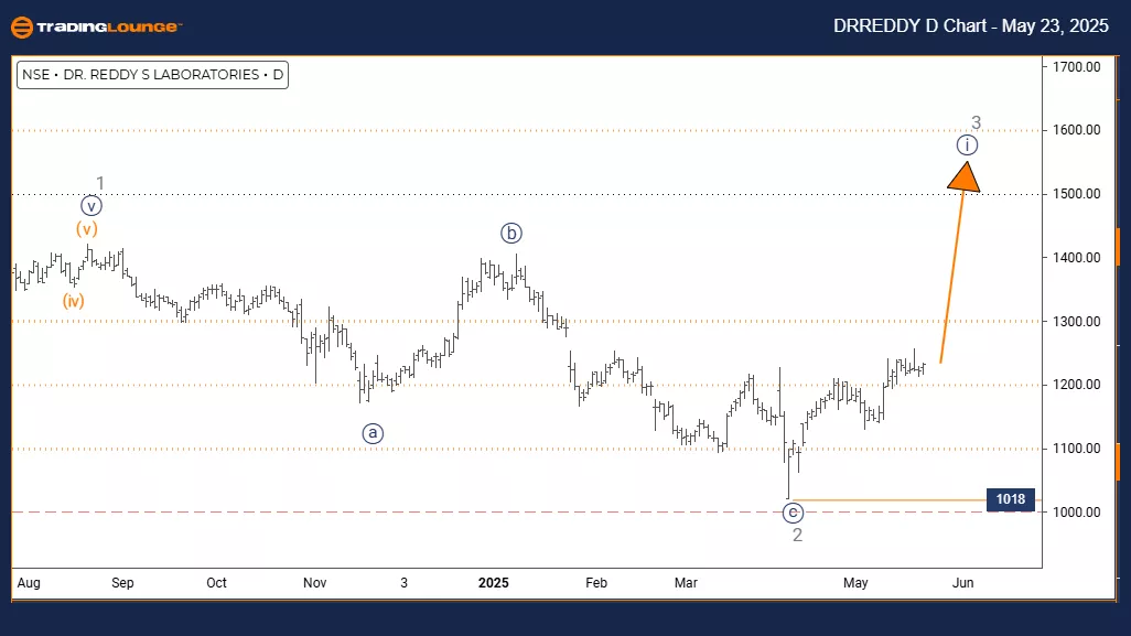 The daily chart analysis signals strong bullish momentum in Dr Reddy’s Laboratories, indicating the stock is in an advancing phase. The current wave structure shows Navy Blue Wave 1 progressing within the broader Gray Wave 3, following the end of Gray Wave 2’s corrective movement.