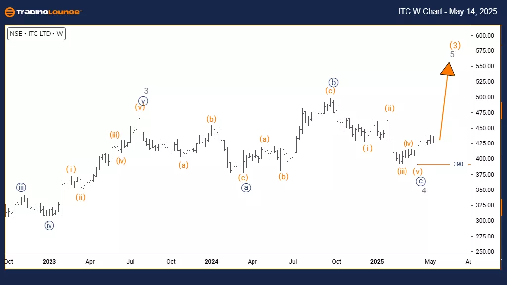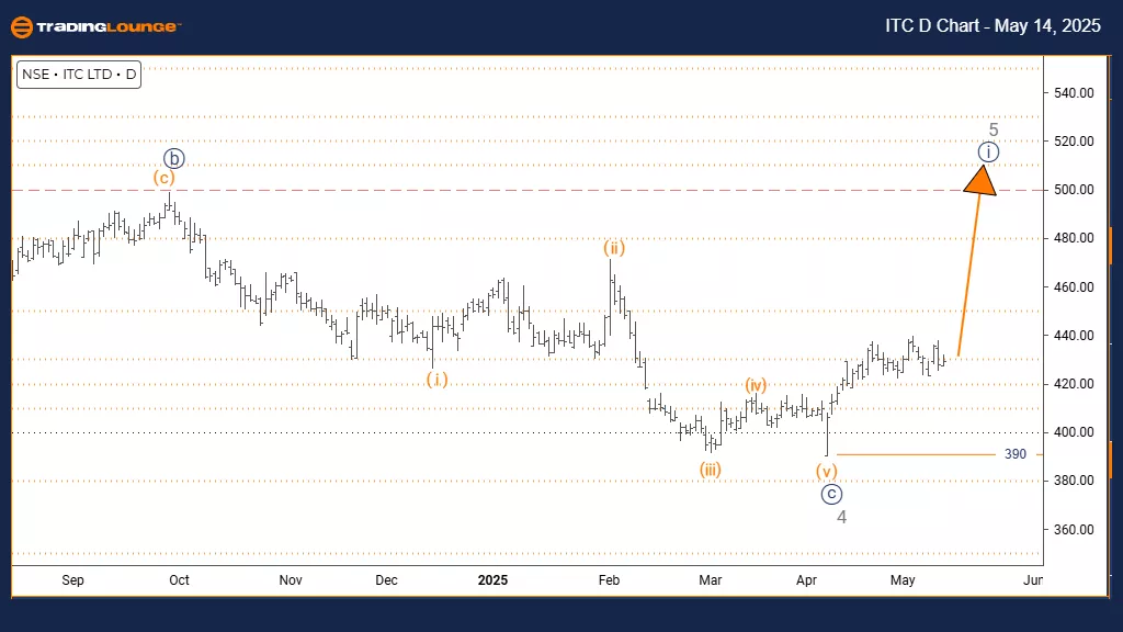 The daily chart analysis of ITC India shows a bullish outlook with an impulsive wave pattern. The current formation features navy blue wave 1 evolving within the larger bullish context of gray wave 5. This suggests gray wave 4 has completed, and the stock has now entered a fresh upward movement. This segment is typically the final advancing phase in a higher-degree Elliott Wave cycle, often accompanied by notable buying strength before potential trend fatigue.