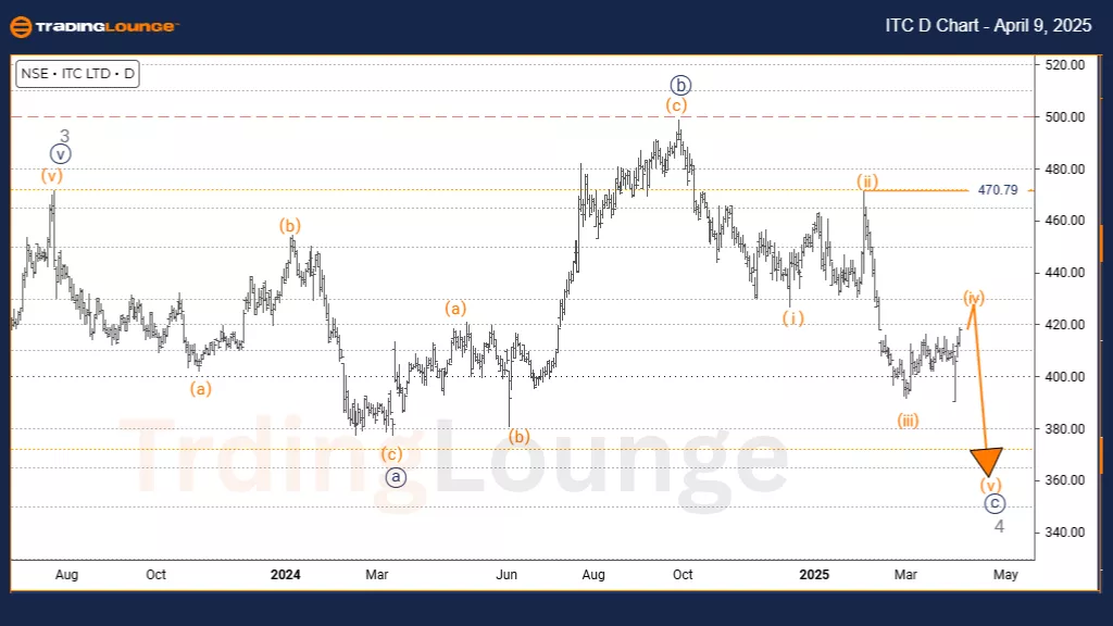 The ITC INDIA Elliott Wave Analysis on the daily chart outlines a counter-trend outlook for the FMCG stock, indicating a corrective phase within a larger pattern. The current focus is on navy blue wave C, which is part of the broader gray wave 4 structure. Analysts note the completion of navy blue wave B's correction, with the stock now moving into navy blue wave C's downward leg. This suggests a temporary pause in the broader trend before potentially resuming upward momentum.