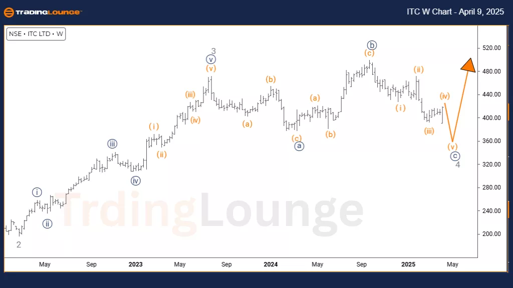 This technical framework reinforces the importance of understanding wave degree relationships, positioning navy blue wave C as both a medium-term trading opportunity and a structural part of the larger gray wave 4. Traders should watch for common corrective behaviors such as three-wave sequences or sideways price action. The setup advises waiting for a clear pattern completion before acting on the next likely move in ITC INDIA. The weekly chart offers valuable guidance for position traders considering short-term pullback setups or preparing for the resumption of the long-term bullish trend.