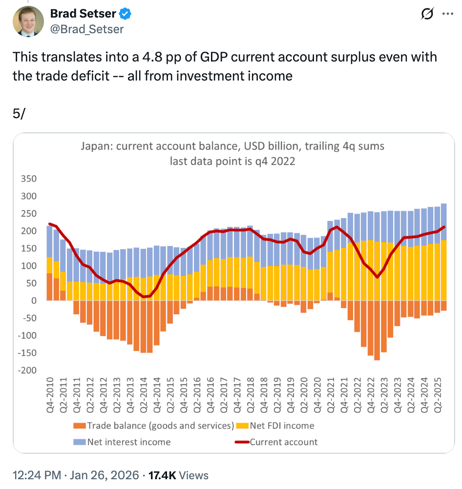 An excellent series of tweets by Brad Setser illustrates how Japan has accumulated a formidable stock of foreign investments: