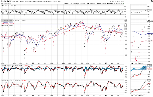To gauge the level of volatility and direction that the SPX may experience from Monday's open onward, keep an eye on the SPX:VIX ratio...daily chart below.