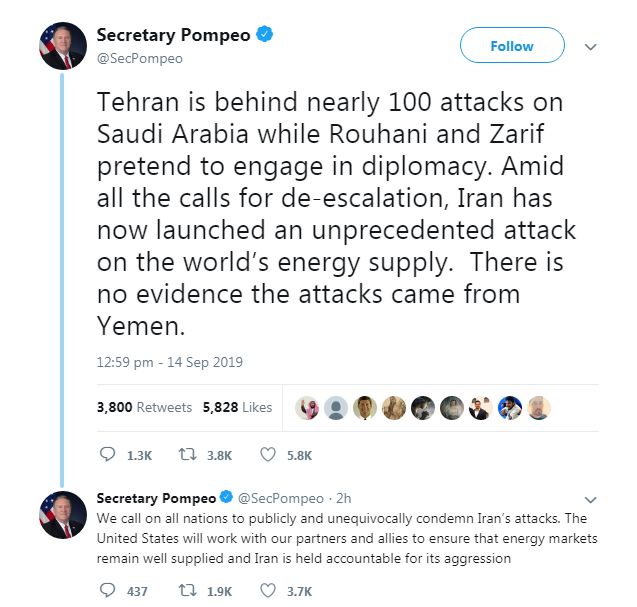 In the several hours that have passed since I posted the subject article, Secretary Pompeo has tweeted the following (he blames Iran, not Yemen, directly for the attack...reports speculate that the nature of the attack was too sophisticated to have been carried out by the Houthi rebels)...