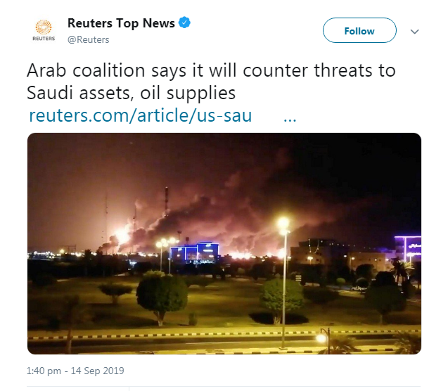 This tweet from Reuters followed (but, exactly what "necessary measures to safeguard national assets, international energy security and ensure stability of world economy" would be taken by a Saudi-led, western-backed, Sunni Muslim military alliance, remains to be seen)...