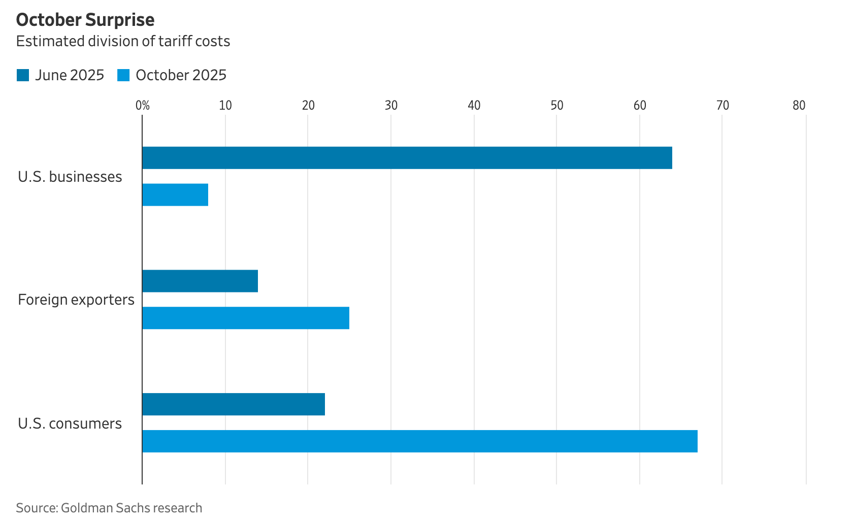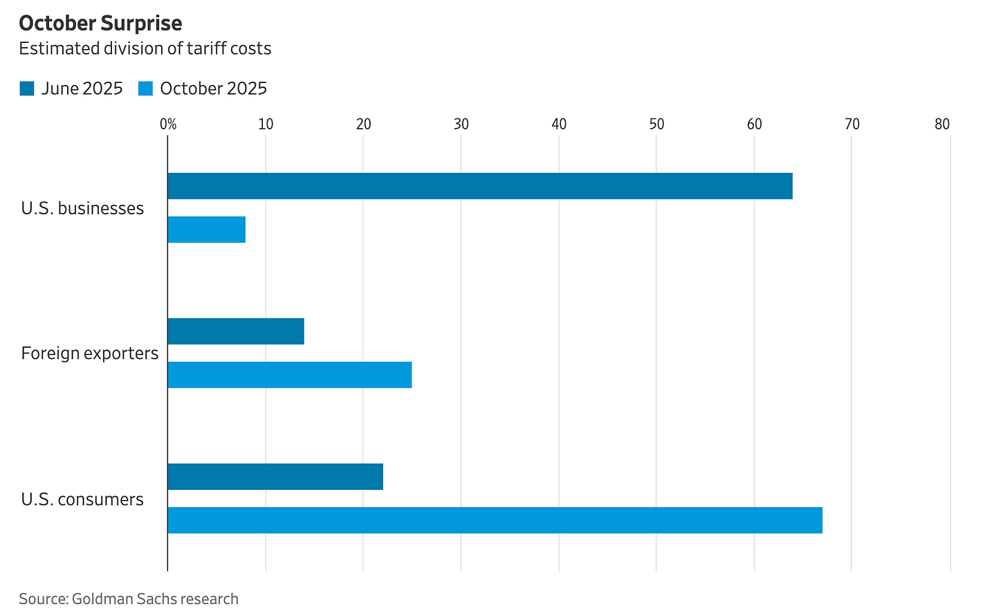Goldman Sachs economists — and I’ll say it outright, they remain among the best sell-side guides to this cycle — have mapped the tariff pass-through in a way that rattles Waller’s narrative. In February, when the first tariff wave landed, U.S. firms largely absorbed the hit. By June, though, about 22% of the costs were already bleeding through to consumers. Their projection is starker: by October, nearly 70% of tariff costs will be passed along. That’s not a nuisance. That’s a second fuse, burning quietly beneath the market’s celebration of imminent rate cuts.