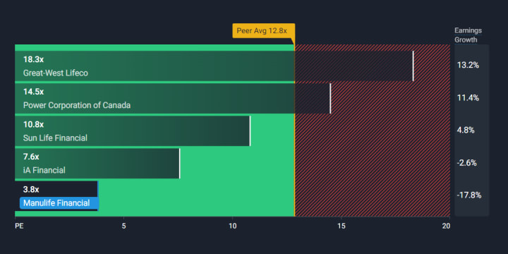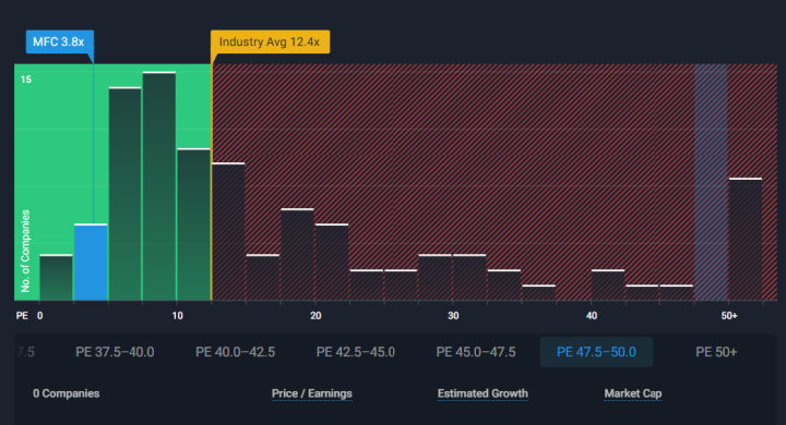 Value investing: Focus on fundamental factors and identify entry points during periods of undervaluation based on price-to-earnings. MFC’s PE Ratio for today is 3.87, let’s check out MFC's PE Ratio compared to its peers and E Ratio compare vs other companies in the North American Insurance Industry and see where they stand.